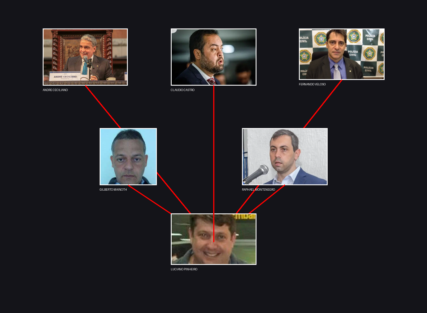 Rede de proteção identificada: Governador Cláudio Castro · Cel. Alexandre Azevedo (SEAP) · Rafael Montenegro (SEAP, preso) · Del. Fernando da Silva Veloso (SEAP) · André Lazaroni (ALERJ) · Rodrigo Amorim (ALERJ) · Corregedora Fúlvia (SEAP) · "Menor P" / "Nem da Rocinha" (CV)